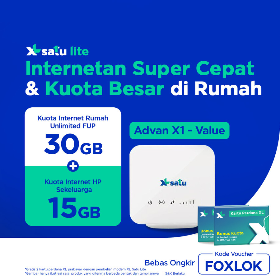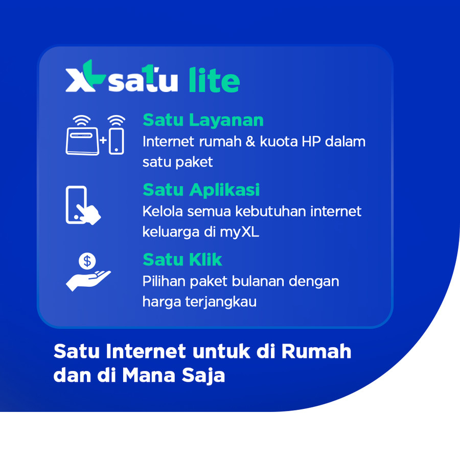 Dengan berlangganan Paket XL SATU Lite, Anda mendapatkan akses unlimited dari modem wireless router untuk internetan di rumah Anda + kuota data yang bisa dibagi ke HP Anda dan keluarga, semua dalam 1 layanan. Nikmati kemudahan aktivasi paket, atur limit pemakaian, dan beli paket tambahan di aplikasi myXL.