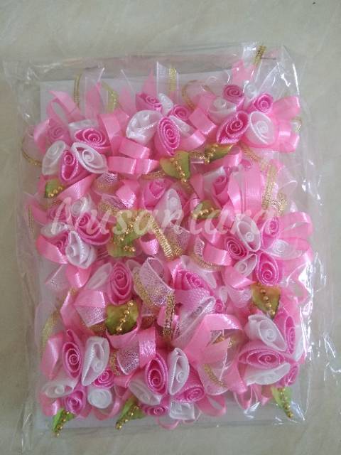 Bunga berbahan dasar pita, bisa untuk bunga dada panitia, bunga suvenir, kerajinan tangan dll. harga per lusin hanya bunga, belum ada penitinya. ukuran bunga +/- 7cm