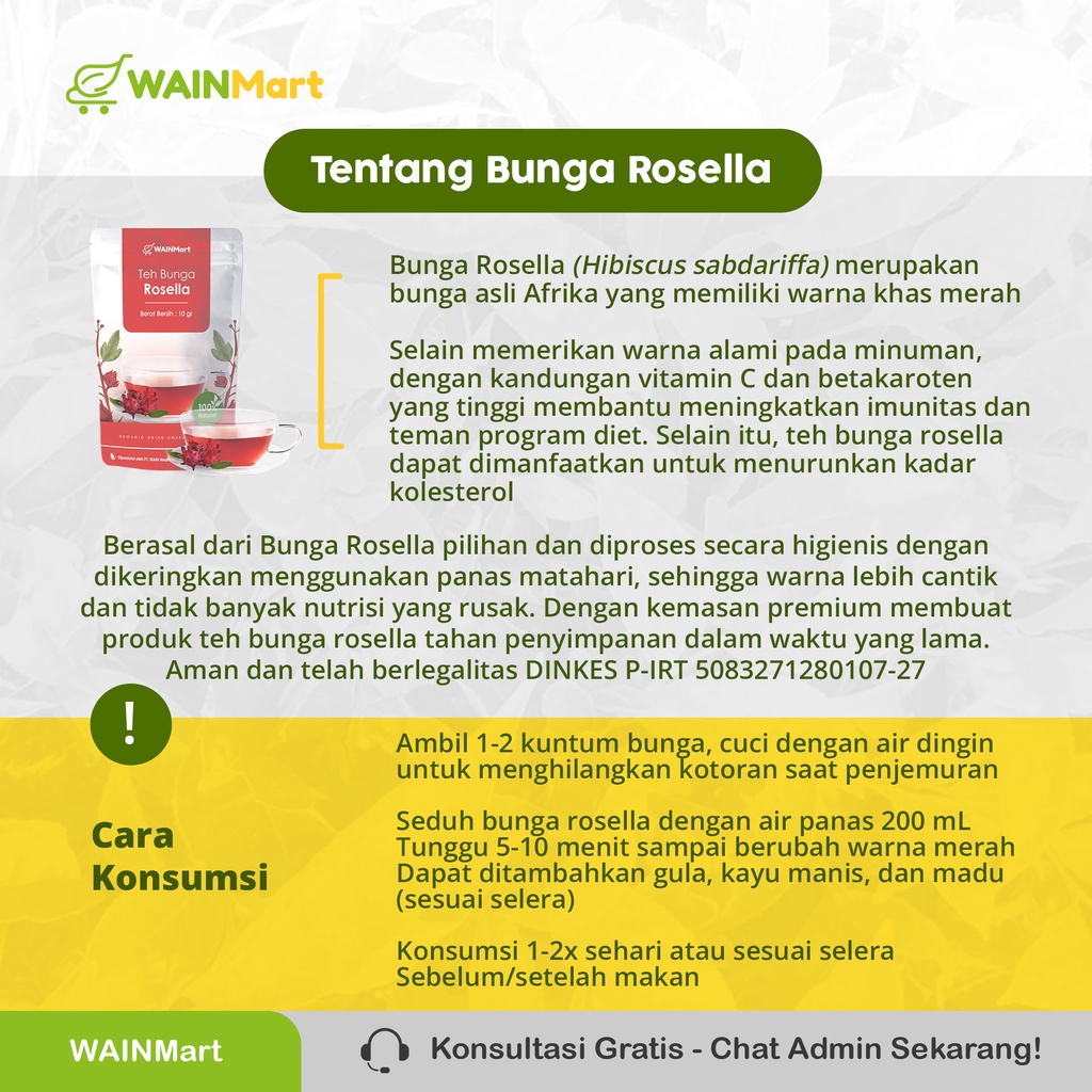 "Berat Bersih/Isi : 10 gram Komposisi : 100% Bunga Rosella kering Legalitas : Dinkes P-IRT 5083271280107-27 Cara Konsumsi : Konsumsi teh 2-3 kali sehari setelah makan Cara Penyeduhan : Ambil 1-2 kuntum bunga, Seduh bunga telang dengan air panas 200 mL tunggu 5-10 menit sampai berubah warna merah, dapat ditambahkan gula, jahe, kayu manis, dan madu (sesuai selera)