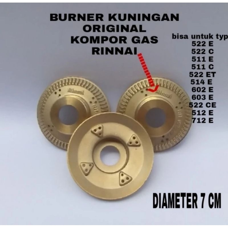 BURNER RING API KUNINGAN SPAREPART ORIGINAL UNTUK KOMPOR GAS RINNAI DIAMETER LINGKAR LUAR 7 CM DIAME5ER LUBANG LUAR 3,1 CM DIAMETER LUBANG DALAM 1 8 CM COCOK UNTUK RINNAI TYPE ; Rl-511 E Rl-512 E Rl-514 E Rl-522 E Rl-522 ET Rl-522 C Rl-522 CE Rl-602 E Rl-603 E Rl-511 E Rl-512 E Rl-514 E Rl-522 E Rl-522 ET Rl-522 C Rl-522 CE Rl-602 E Rl-603 E