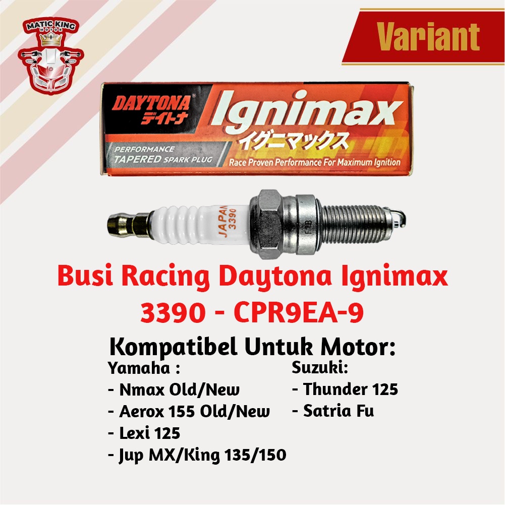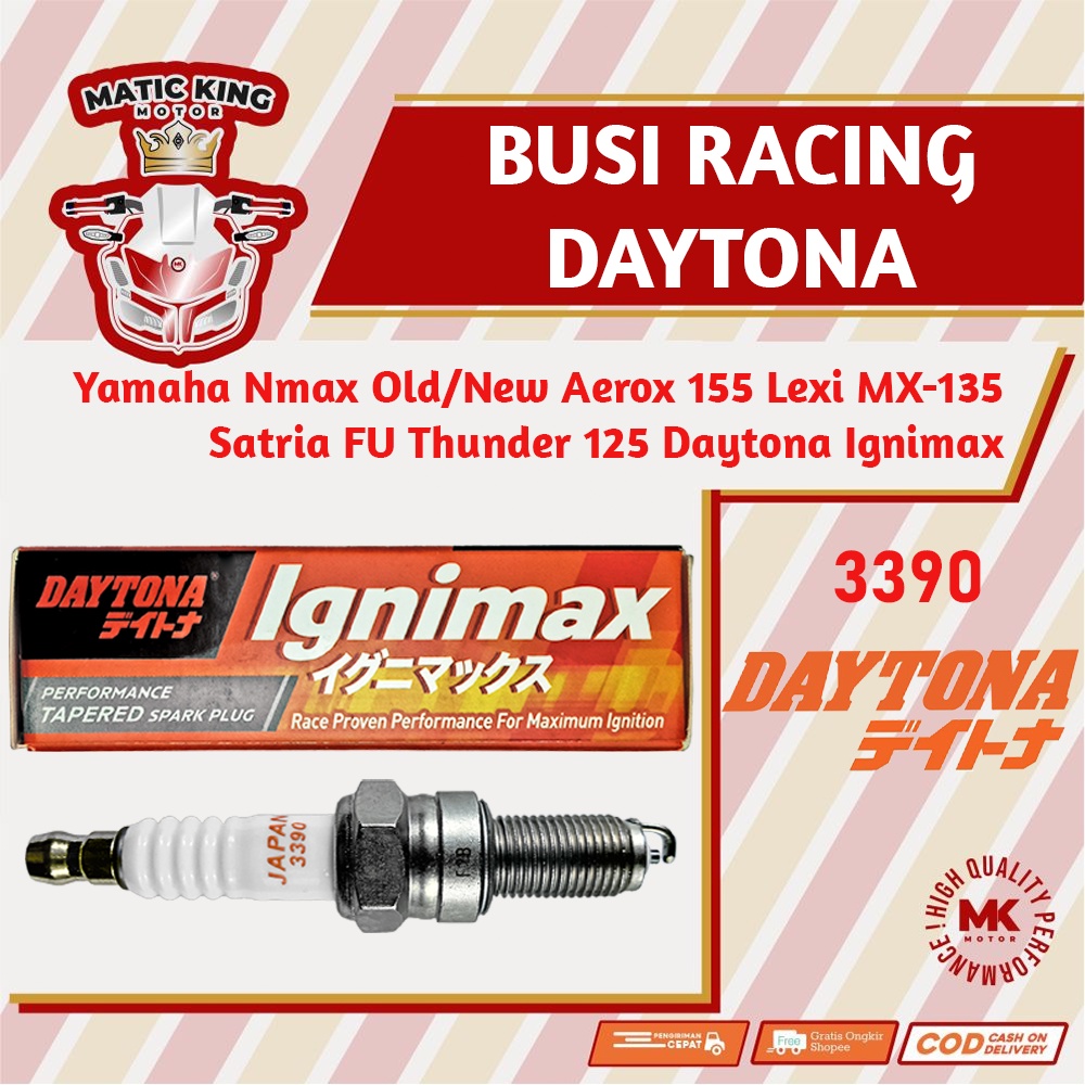 Busi Racing Nmax Satria FU Aerox Jupiter MX Fi Thunder Lexi 125 135 150 155 DAYTONA IGNIMAX 3390 Busi merupakan salah satu komponen yang cukup vital dalam sistem pengapian di mesin motor. Selain itu, busi juga bisa menjadi alternatif cara instan menaikan performa motor. Daytona Ignimax Spark Plug adalah kelas busi Racing, yg cocok utk road race maupun utk harian.