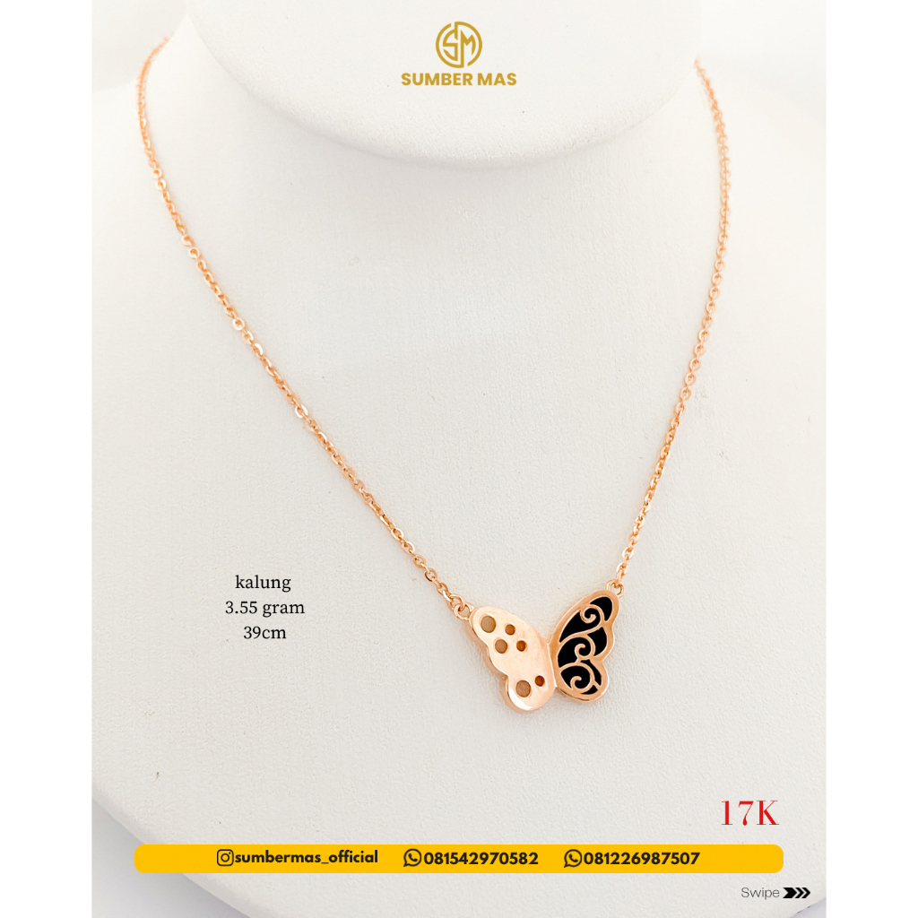 Nama Barang : BUTTERFLY FASHION ONE SET Berat : 3.5gr - 3.6gr Ukuran : 19cm - 39cm Variasi : ROSE GOLD Kadar Emas : 17K (750) Keuntungan Membeli Perhiasan di Toko Emas Sumber Mas
