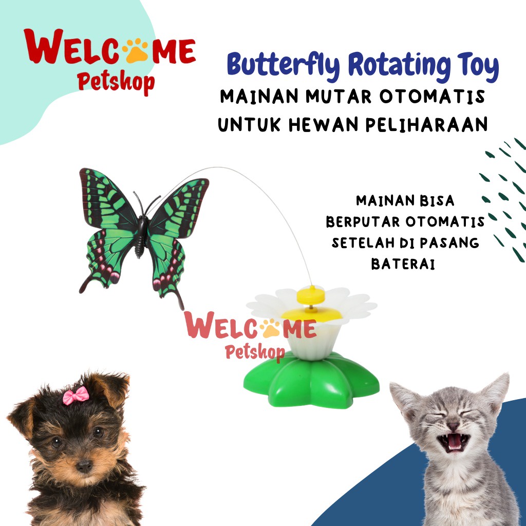 Butterfly Rotating Toy mainan kucing elektrik yang bisa berputar otomatis. Kucing dapat bermain dan mengejar kupu-kupu agar tidak cepat bosan saat dirumah.