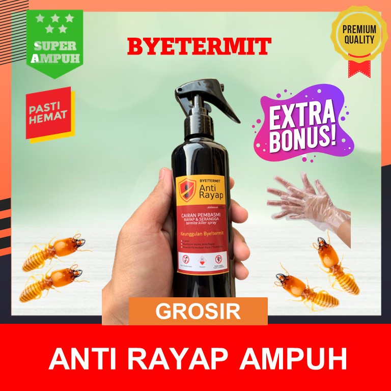 ByeTermit adalah cairan pembasmi rayap dan serangga atau termite killer spray super ampuh. Terbuat dari bahan khusus yang ampuh untuk membasmi rayap hingga ke koloni. PRAKTIS dan AMAN digunakan pada segala jenis kayu dan furniture Anda. Bisa juga digunakan sebagai bahan pengawet kayu.