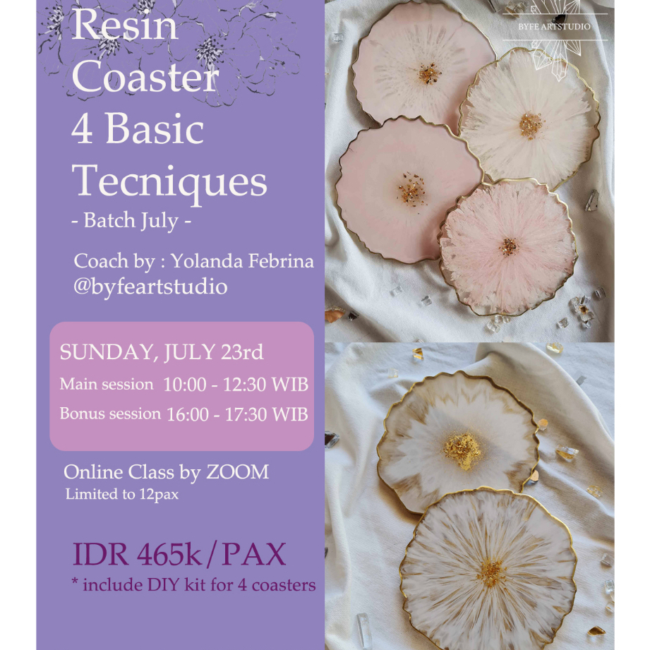 - DIY kit bisa digunakan hingga 4 coaster TERDIRI DARI 2 SESI DENGAN MATERI BERBEDA (diharapkan join semua sesi) - Main session: akan diajarkan 4 teknik dasar motif coaster dan dapat diaplikasikan langsung 2 teknik ketika workshop. - Bonus session: akan diajarkan teknik top coating, finishing hingga mewarnai pinggiran coaster, praktek top coating langsung, Q&A session - Harap bekerja di ruang terbuka dengan sirkulasi udara yang baik, serta jangan lupa melapisi meja kerja dengan plastik agar ketika ada tumpahan resin tidak mengotori meja tersebut - WAJIB menggunakan masker