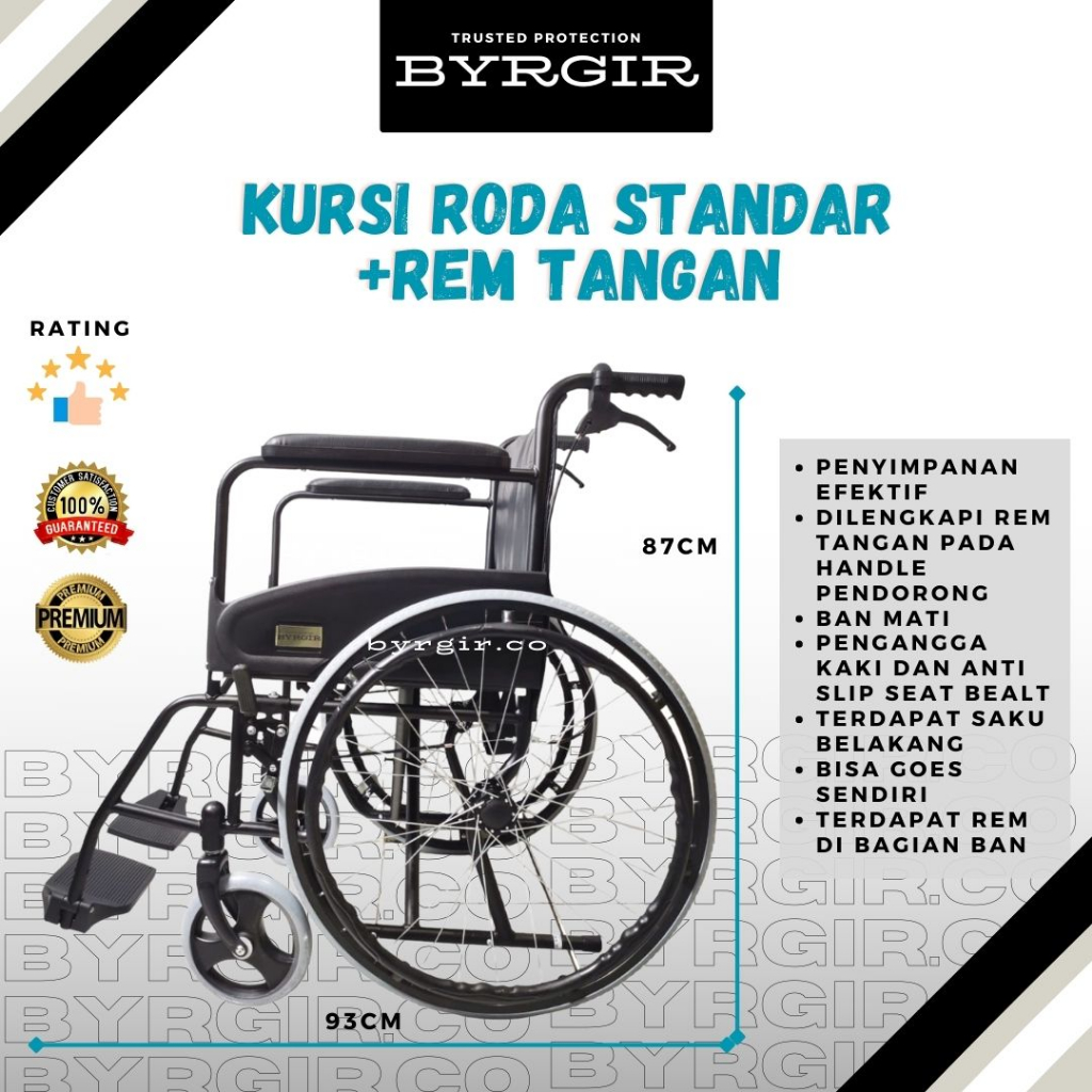 Spesifikasi Produk - Berat badan pasien maksimal 100 kg - Tinggi badan pasien 145 cm ke atas - Bahan rangka Chromed steel - Bantalan kursi empuk - Ada rem roda untuk pasien sendiri - Roda produk memakai ban mati dan juga ukurannya pas tidak terlalu tinggi dan tidak terlalu kecil - Bisa utk menjalankan kursinya secara mandiri tanpa harus selalu dibantu dorongan dari belakang. - Konstruksi menggunakan bahan besi atau chromed steel - Bisa dilipat full dan bisa masuk mobil - Dilengkapi pengunci untuk pendorong seperti tuas motor beat, - Bagian pinggang di desain lebih lebar agar pasien merasa nyaman pada saat menggunakannya - Jenis ban mati - Belakang sandaran dilengkapi kantong untuk menyimpan barang - Ukuran roda pas - Terdapat sandaran kaki yang dapat dibongkar-pasang - Terdapat pengunci ban - Dilengkapi rem tangan dihandle pendorong - Menggunakan ban mati