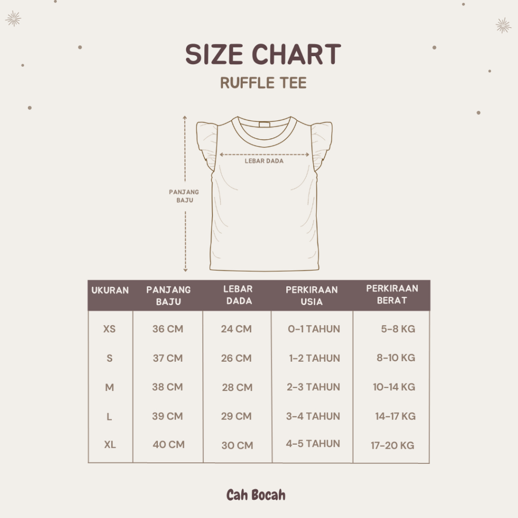 Tersedia dalam 5 size : 1- 5 Tahun Detail Size Chart di slide kedua, toleransi ukuran +- 1-2 CM Size Chart hanya ukuran rekomendasi agar bisa menentukan size yang pas untuk si buah hati, boleh diukur dulu ya mommies 😊