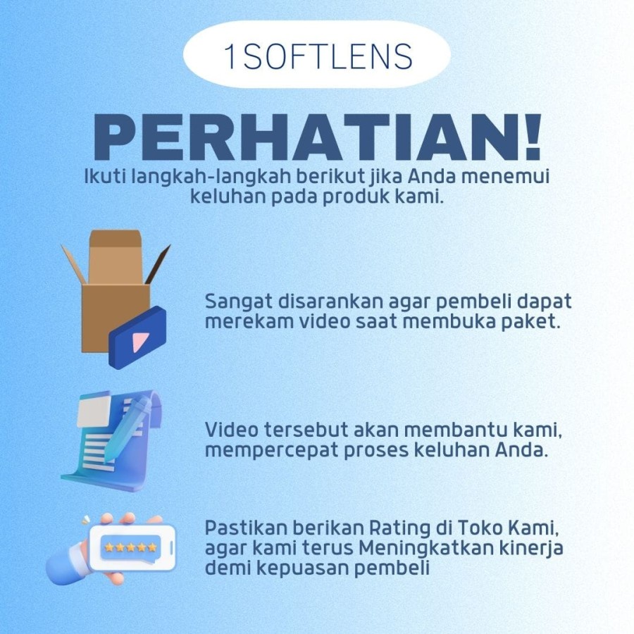 • Catatan Pengiriman 1. Cantumkan ukuran pada note/catatan sesuai dengan ukuran anda. Untuk pembelian softlens warna sertakan warna yang anda inginkan sesuai dengan dideskripsi, jika tidak mencantumkan warna yang dimau atau konfirmasi Admin via chat. Maka pesanan akan dikirimkan sesuai ukuran Anda dengan warna random yang Ready. 2. Pengiriman dilakukan Hari Senin - Minggu sampai jam 17.00 WIB.