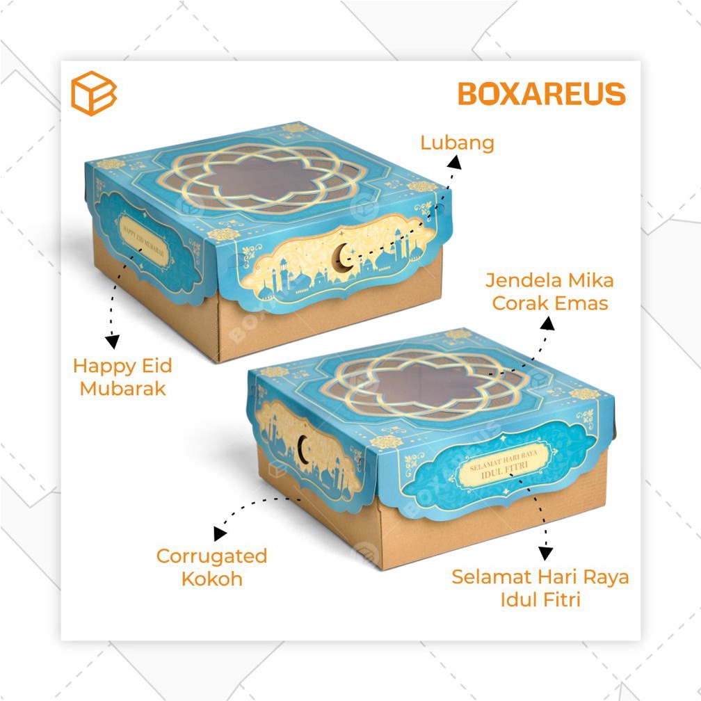 Cake Box ini mempercantik produk anda dengan desain dan warna-warna elegan meriah bernuansa Idul Fitri / Lebaran. Cake Box instan, praktis, dan siap pakai, produk auto-keren dengan box ini. Cocok untuk kue bolu, marmercake, chiffon, lapis legit, tart, pound/sponge cake, peralatan sholat (mukena/sarung, sajadah), dll.