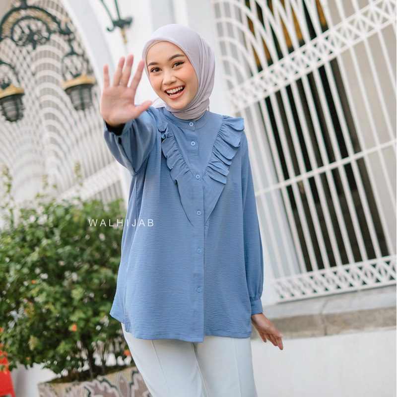 blouse kali ini didesain cantik banget, dengan aksen ruffle dibagian dada🥰menggunakan bahan katun crinkle yang adem, jatuh, dan ironless. Cocok banget dipakai kerja ataupun jalan jalan🥰