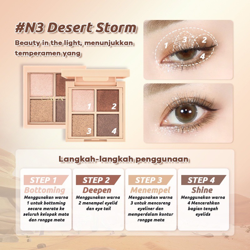 Cara penggunaan STEP 1: Menggunakan warna 1 untuk bottoming secara merata ke seluruh kelopak mata dan rongga mata STEP 2: Menggunakan warna 2 menempel eyelid dan eye tail STEP 3: Menggunakan warna 3 untuk mencoreng eyeliner dan memperdalam kontur rongga mata STEP 4: Menggunakan warna 4 Mencerahkan bagian tengah eyelids