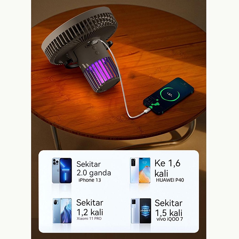 Features: Diimpor dari Jerman, canggih 3 in 1, outdoor, pembunuh nyamuk rumah + kipas daya tinggi + powerbank Dapat membunuh nyamuk, menciptakan lingkungan berkemah luar ruangan yang nyaman; Penggunaan 3 in 1, dapat digunakan sebagai kipas vertikal, kipas langit-langit dan lampu langit-langit; Desain dilepas, mudah untuk menyimpan dan menghemat ruang; Dapat digunakan sebagai bank daya untuk mengisi daya kipas dan telepon; Baterai berkapasitas besar 8000 mAh, daya tahan baterai super lama; Dilengkapi dengan remote control infra merah, mudah untuk mengontrol kipas dari jarak jauh; 3 kecepatan angin disesuaikan untuk memenuhi kebutuhan pendinginan yang berbeda.