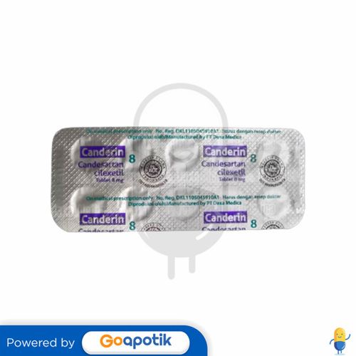 Deskripsi : PENGGUNAAN OBAT INI HARUS SESUAI PETUNJUK DOKTER.Untuk hipertensi dan gagal jantung, serta gangguan fungsi sistolik ventrikel kiri ketika obat ACE (Angiotensin Converting Enzyme) inhibitor tidak ditoleransi. | Komposisi : Tiap tablet mengandung candesartan cilexetil 8 mg | Dosis : ATURAN PAKAI HARUS SESUAI DENGAN PETUNJUK DOKTER.Hipertensi: Dosis awal 8 mg perhari. Dosis dapat dinaikkan sesuai dengan respon pengobatan sampai maksimum 16 mg perhari. Efek antihipertensi maksimal akan dicapai dalam waktu 4 minggu setelah pengobatan.Gagal jantung: Dosis awal 4 mg sehari sekali, dapat digandakan dengan jarak waktu kurang dari 2 minggu. Dosis maksimal: 32 mg sekali sehari. | Indikasi : Untuk hipertensi dan gagal jantung, serta gangguan fungsi sistolik ventrikel kiri ketika obat ACE (Angiotensin Converting Enzyme) inhibitor tidak ditoleransi. | Perhatian Khusus : Penggunaan obat antihipertensi pada umumnya digunakan seumur hidup, oleh karena itu lanjutkan terapi walaupun gejala sudah membaik. Jika muncul gejala mual, diare, berkeringat lebih dari biasanya, mengalami penurunan tekanan darah parah, dan tidak ada perubahan tekanan darah setelah menggunakan obat ini selama 4 minggu maka segera hubungi dokter. Pantau tekanan darah secara berkala. Jangan berikan pada ibu hamil dan menyusui. | Kemasan : Strip 10 tablet | NIE : DKL1105045910A1
