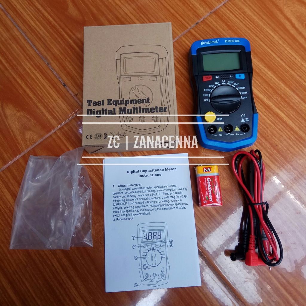 Spesifikasi: Brand: HoldPeak Tipe: DM6013L Skala ukur: 20 mF, 2000 mikro-F, 20 mikro-F, 20 mikro-F, 2 mikro-F, 200 nano-F, 20 nano-F, 2000 piko-F, 200 piko-F Display: Digital Hold Mode: Ada Backlight: Ada Zero Adjust: Ada