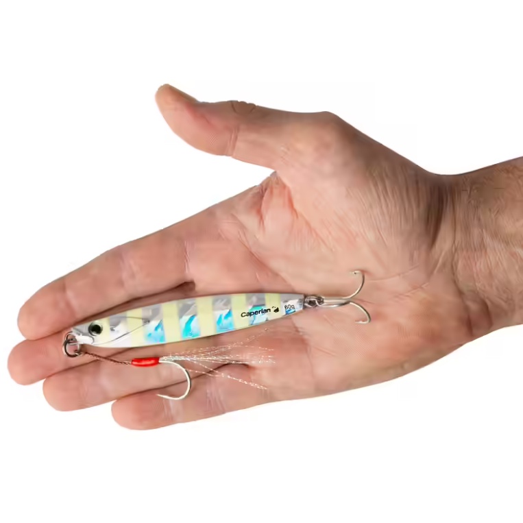 CAPERLAN Jig Umpan Pancing 60g Bentuk 3D Terdapat Kail Bantu -------- Memancing dengan melemparkan jig di laut. Bentuk tersebut membuatnya terlihat seperti ikan yang dimangsa predator. Bentuk 3D membuatnya berenang dengan atraktif ketika tenggelam dan saat ditarik kembali.