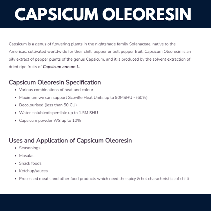 Capsicum oleoresin adalah bahan organik berminyak yang berasal dari buah tanaman dalam genus Capsicum, seperti cabai. Capsicum Oleresin merupakan ekstrak cabai yang umum digunakan pada industri makanan dan obat-obatan untuk menjaga konsistensi produk. Cairan Capsicum ini digunakan sebagai tambahan rasa pedas, aroma, dan warna untuk makanan. Bisa digunakan untuk produksi sambal, keripik, snack, masakan jadi, balsam, obat-obatan, dan lain-lain.