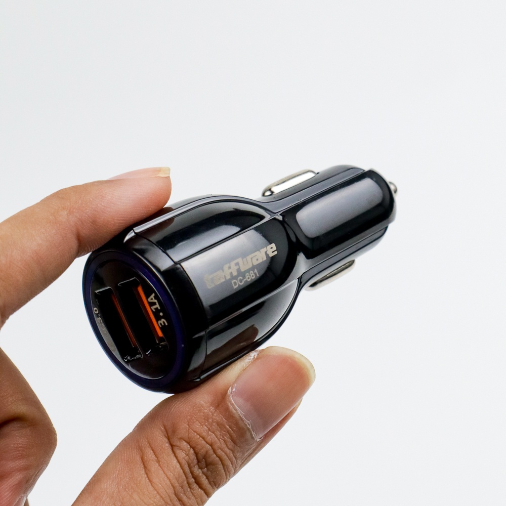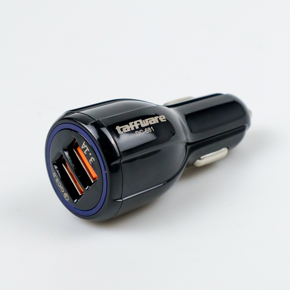 1 x Taffware Car Charger Dual USB Port 3.1A QC3.0 - DC-681 Spesifikasi Jumlah Port 2 Port Voltase Input: DC 12-32 V Output: DC 5.0 V/6 A, 9 V/2 A, 12 V/1.6 A Total Power: 30 W Max Material ABS Dimensi 3.5 x 3.5 x 7.8 cm