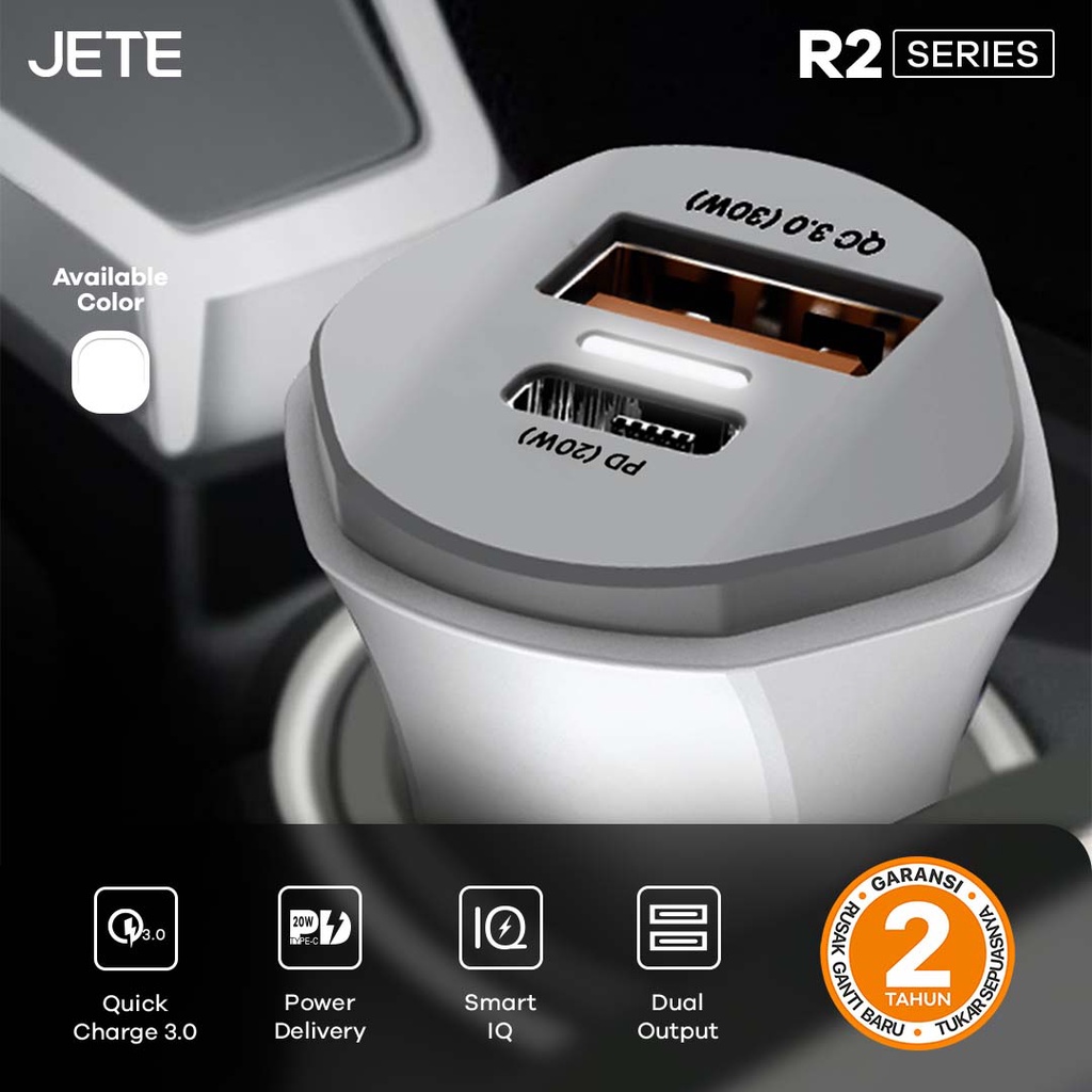 Merk : Jete Model : R2 Port : Type C & USB Output 1 : Power Delivery (20W) Output 2 : Quick Charge 3.0 (18W) Input : DC 12V-24V Color : Putih