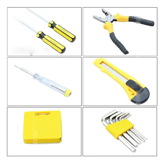 1pc Tape Measure (1M) = Alat Ukuran Meter 2pcs screwdrivers = Obeng 1pc electrical PVC tape = Isolasi untuk Listrik 1pc utility knife = Pisau Cutter 1pc Test Pen 1PC Claw Hammer (8oz) = Tukul besi 1pc 6 "combination pliers = Spana 1pc Boxes Case = Kotak Tempat Penyimpanan