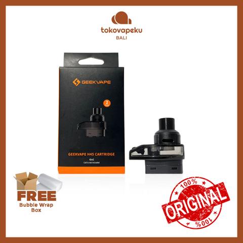 CARTRIDGE AEGIS H45 CATRDIGE AEGIS HERO 2 4ML AUTHENTIC by GEEKVAPE . Cartridge Geekvape H45 memiliki kapasitas 4ml dengan desain pengisian atas dan kompatibel dengan Coil seri Geekvape B. . Harga untuk per 1 pcs Cartridge ya! . Parameter : - Capacity : 4ml - Quantity : 2pcs/pack . Features: - 4ml capacity - Top filling design - Compatible with Geekvape B series coil . Untuk kalian juga yang sedang mencari sebuah Coil dan Liquid yang cocok untuk di padukan dengan Cartridge Aegis H45 ini, kalian bisa langsung aja chat aku untuk rekomendasi nya ya Toku Squad :) . NOTICE : - Barang 100% Ori, No CLONE ! ( Mohon DIBACA ) - Barang kita packing dengan Dus dan dilengkapi dengan bubble wrap untuk pengiriman menggunakan ekspedisi selain Instant & Same Day - Untuk Komplain wajib menyertakan Vidio Unboxing saat barang datang! - Bertanya Terlebih dahulu sebelum memesan - Kepuasan dan Kepercayaan pembeli sangat berarti untuk kami - Untuk garansi toko hanya berlaku 1x24 jam setelah barang sampai . CARTRIDGE AEGIS H45 CATRDIGE AEGIS HERO 2 4ML AUTHENTIC by GEEKVAPE