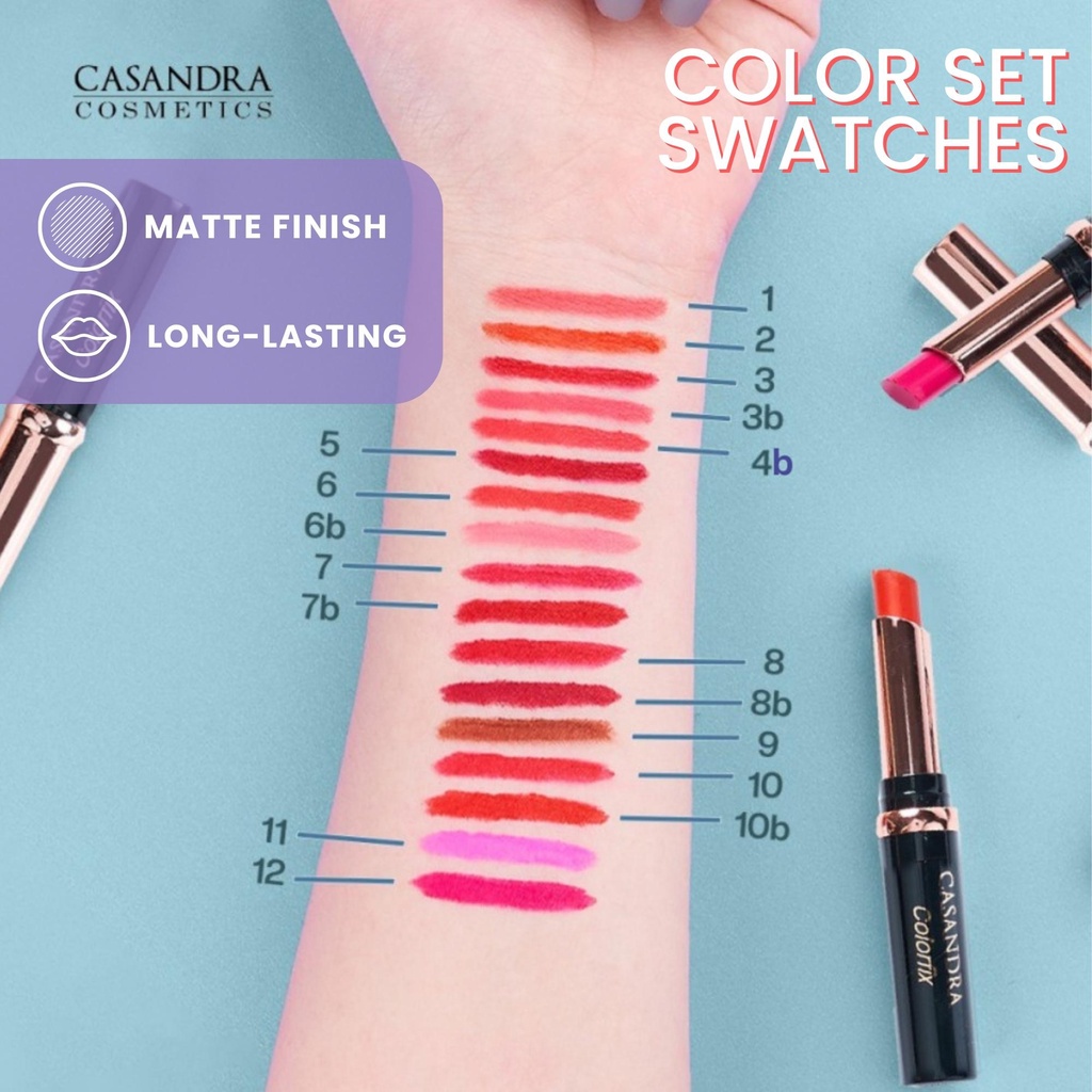 Casandra Colorfix Lipstick merupakan lipstick matte bertekstur lembut dengan partikel sangat halus yang dibalut beragam pilihan warna menarik menjadikan bibir kamu terlihat sehat.
