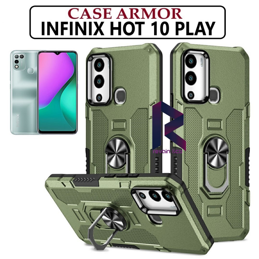 Detail Case Armor INFINIX HOT 10 PLAY Iring Cincin Magnetic Kesing Hp Protect kamera Premium Hard Case Standing Robot Pelindung Kamera