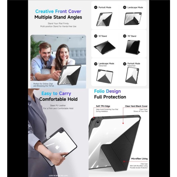 Made of premium solvent-free PU leather with clear plastic back cover. Creative front cover offers multiple stand angles to free your hands when viewing, browsing on the tablet. Clear back cover can be detached from the front cover and used independently, which is perfect for playing games on the tablet. Smart folio offers wake/sleep function, it automatically wakes your tablet when opened and puts it to sleep when closed. Discreet built-in groove for Apple Pencil storage supports wireless charging. Protects your tablet body and screen against scratches, dirty, oil and shock. Buttons and earphone ports remain easily accessible.