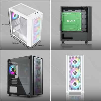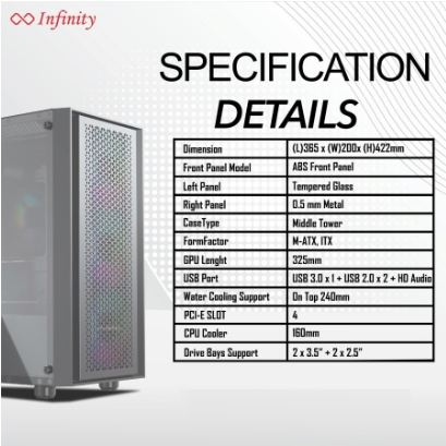 IDimension 365mm (L) X 200mm (W) X 422mm (H) Front Panel ABS Front Panel Side Panel Tempered Glass Case Type Middle Tower Form Factor ITX, Micro-ATX CPU Cooler Length 160mm / 16cm (Max) GPU Length 325mm / 32,5cm (Max) Drive Bays Support 2 x HDD 3.5 ” / 2x SSD 2.5″