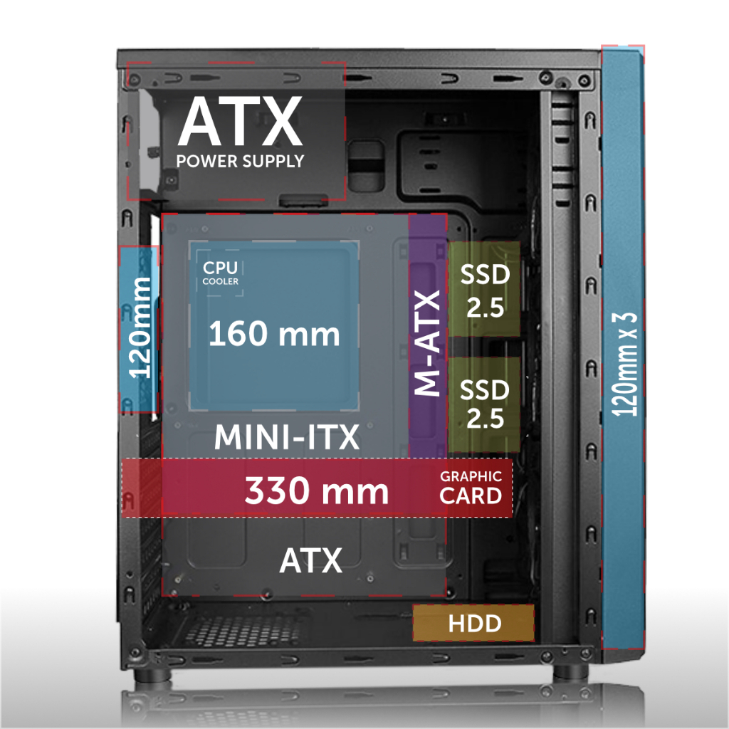 Spesifikasi Dimension : 350 (L) X 180 (W) X 425(H) Front Panel : ABS, Mesh Front Panel Case Factor Mini-ITX, Micro-Atx, ATX CPU Cooler Length : 160mm / 16cm (Max) Drive Bays Support 1x HDD 3.5 " / 2x SSD 2.5 " Non FAN System Fan Support : Front : 3x 120mm (12cm) Rear : 1x 120mm (12cm)