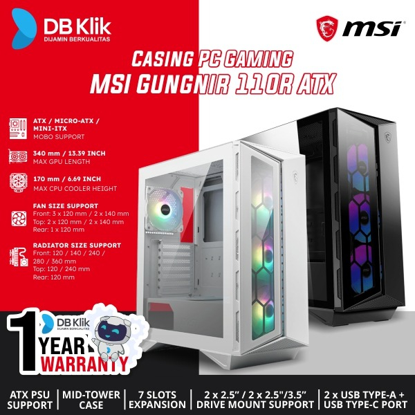 SPECIFICATIONS Product Name MPG GUNGNIR 110R WHITE Form Factor Mid-Tower Motherboard Form Factor Support ATX / Micro-ATX / Mini-ITX I/O Ports 2 x USB 3.2 Gen 1 Type-A (5Gbps) 1 x USB 3.2 Gen 2x2 Type-C (20Gbps) 1 x LED Switch Button 1 x Audio-out 1 x Mic-in Drive Mount Support 2 x 2.5” 2 x 2.5"/3.5” Expansion Slots 7 Maximum GPU Length 340 mm / 13.39 inches Maximum CPU Cooler Height 170 mm / 6.69 inches Power Supply Support ATX Maximum PSU Length 250 mm / 9.84 inches Fan Size Support Front: 3 x 120 mm / 2 x 140 mm Top: 2 x 120 mm / 2 x 140 mm Rear: 1 x 120 mm Pre-installed Fan Size Front: 3 x 120 mm Rear: 1 x 120 mm Pre-installed Fan Type Front: 3 x ARGB Fan Rear: 1 x ARGB Fan Radiator Size Support Front: 120 / 140 / 240 / 280 / 360 mm Top: 120 / 240 mm Rear: 120 mm Dimensions (DxWxH) 430 x 215 x 480 mm / 16.93 x 8.46 x 18.9 inches Net Weight 7.9 kg / 17.4 lbs