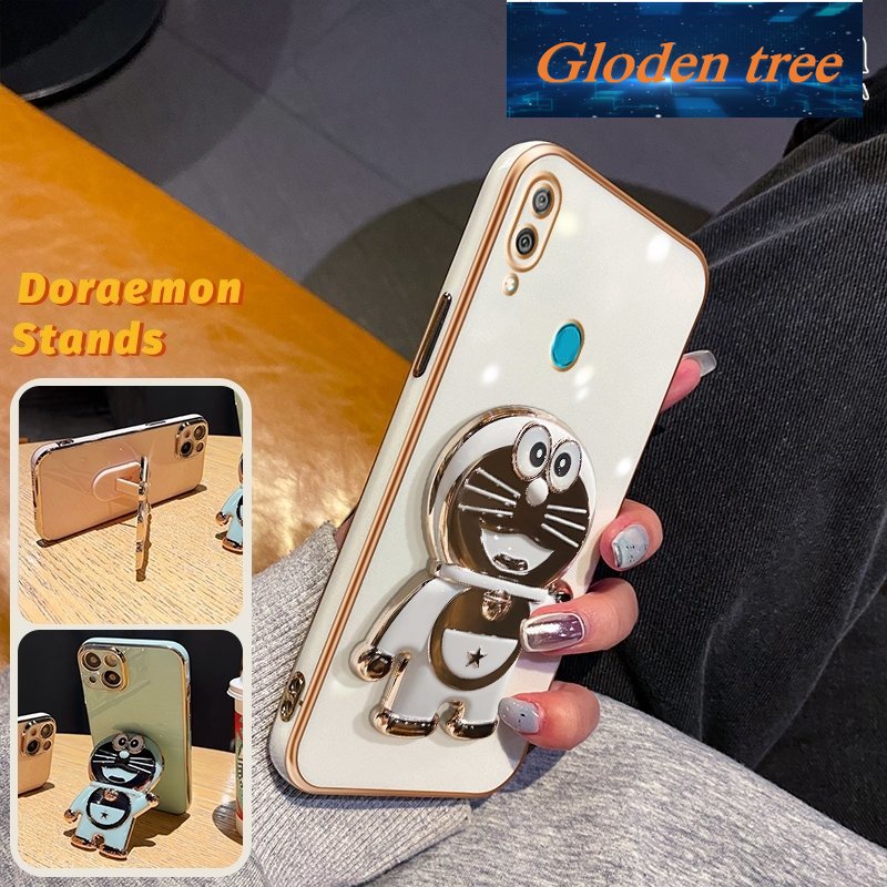 Detail Casing Pohon Gloden Untuk Huawei Y7 2019 Y7 Prime 2019 Case Fashion Kartun Doraemon Lipat Stand Phone Case Electroplating Shockproof Phone Holder Case