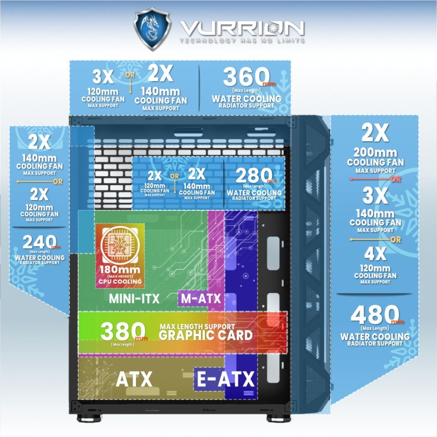 ◤ Material : ◉ 0,8 Thicness Steel : ● 2 Side Tempered Glass ◤ Dimension : [L] 485 x [W] 247 x [H] 566mm ◤ Drive Bays : ◉ 2 x 3,5" HDD, 2 x 2,5" SSD or : ● 2 x 3,5" HDD ◤ I/O Port : 2 x USB3.0, & 2 x USB2.0, HD AUDIO ◤ PCI SLOT : 9 Standard Slot +2 Vertical Slots ◉ HARDWARE SUPPORT ● MOTHERBOARD : E-ATX, ATX, M-ATX, MINI-ITX ● POWER SUPPLY : Standard PS2 ATX PSU ● FAN Support ◉ Front : 4 x 120mm | 3 X 140mm 480mm ● Rear : 2 x 120mm | 2 X 140mm 240mm ● Top : 3 x 120mm | 2 X 140mm 360mm ● MBside : 2 x 120mm | 2 X 140mm 280mm ● AIO RADIATOR ◉ Front : 480mm ● Rear : 240mm ● Top : 360mm ● MBside : 280mm ● CPU COOLER : 180mm [Max Height] ● VGA GRAPHIC CARD : 380mm [Max Length]