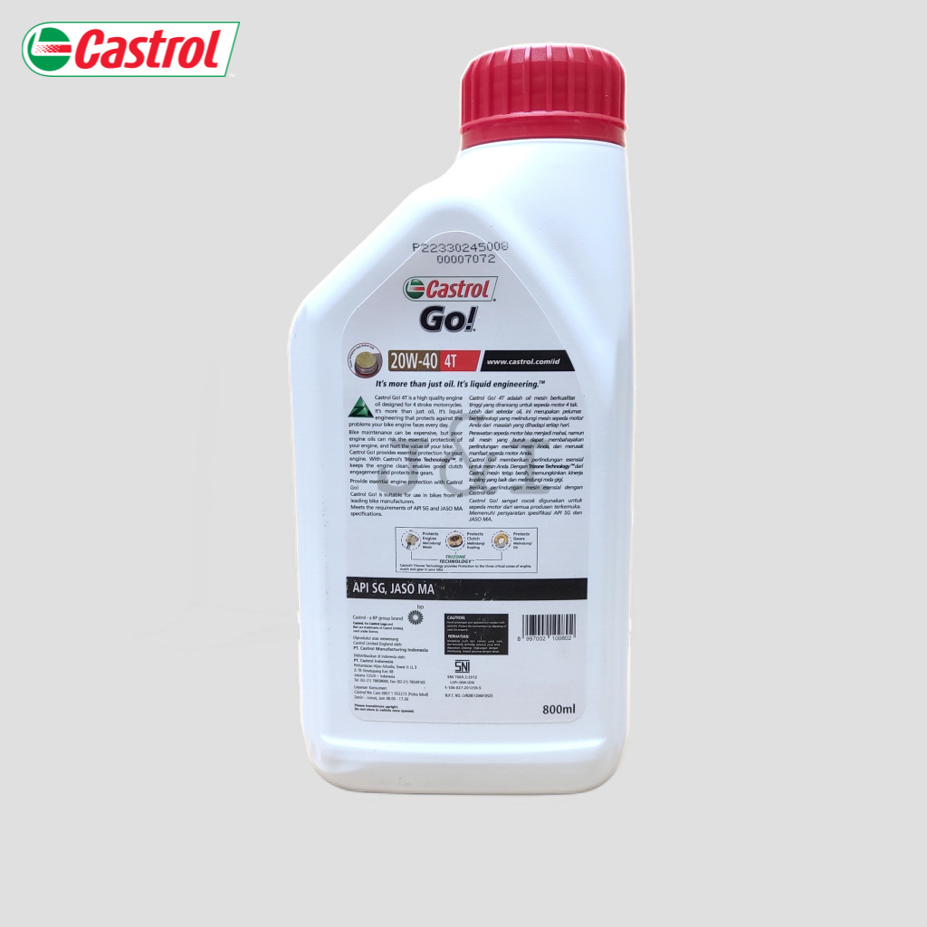 Oli Castrol GO 20W-40 API SG JASO MA 0,8 Liter Castrol GO! 4T adalah oli mesin berkualitas tinggi yang dirancang untuk sepeda motor 4 tak. Lebih dari sekedar oli, ini merupakan pelumas berteknologi yang melindungi mesin sepeda moto anda dari masalah yang dihadapi setiap hari. Perawatan sepeda motor bisa menjadi mahal, namun oli mesin yang buruk dapat membahayakan perlindungan esensial mesin anda, dan merusak manfaat sepeda motor anda. Castrol GO! memberikan perlindungan esensial untuk mesin anda dengan Trizone Technology dari castrol, mesin tetap bersih, memungkinkan kinerja kopling yang baik dan melindungi roda gigi. Berikan perlindungan mesin esensial dengan Castrol GO! Castrol GO! sangat cocok digunkanan untuk sepeda motor dari semua produsen terkemuka. Memenuhi persyaratan spesifikasi API SG dan JASO MA.