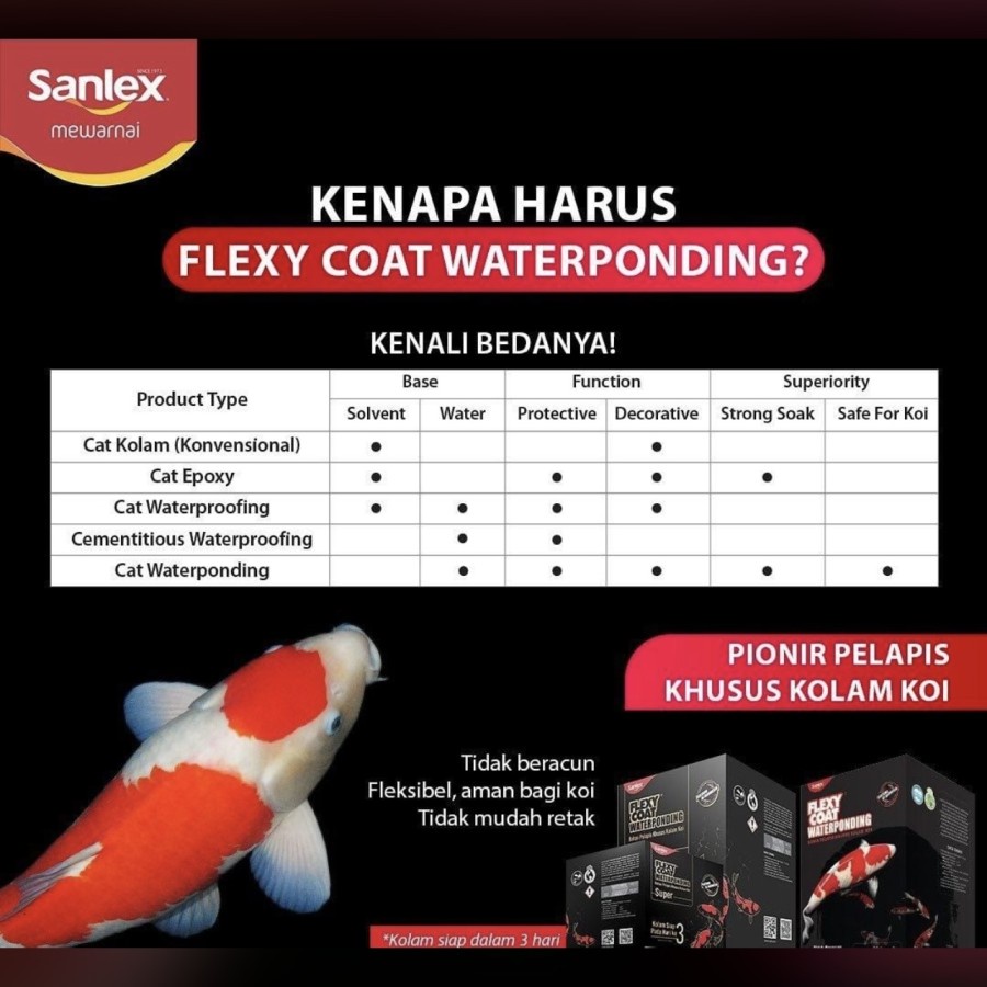 NEW PRODUCT SUPER FLEXY COAT !!! Perbedaan dengan flexy coat reguler - Proses pengeringan lebih cepat 3 hari kolam siap di gunakan - Hasil cat lebih lentur dan elastis aman untuk tubuh koi - Warna lebih pekat