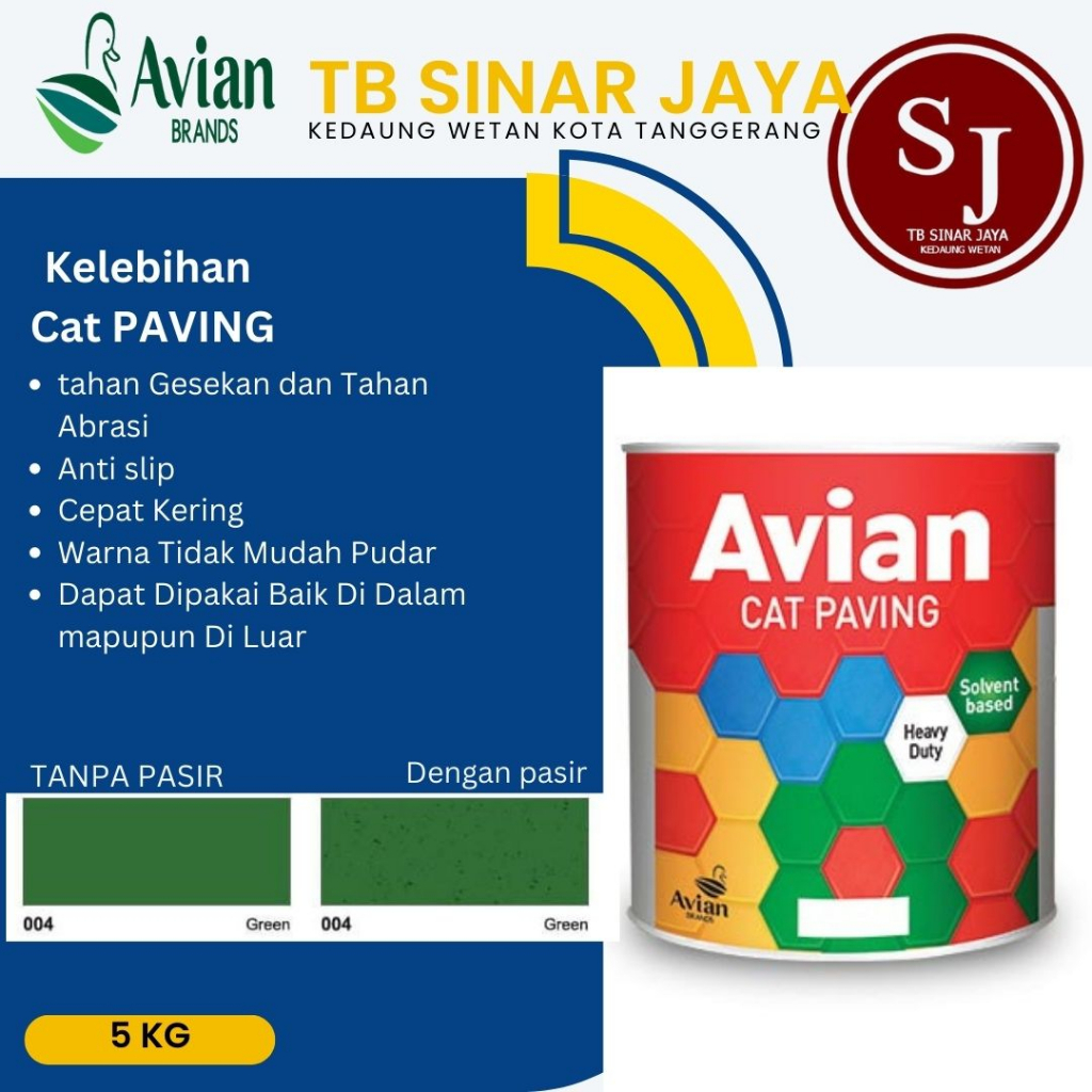 AVIAN CAT PAVING UKURAN isi 5 KG Berat Total Barang : 6.3 KG. SOLVENT BASED (PENGENCER THINNER) TERDIRI DARI 2 KOMPONEN YAITU: CAIRAN CAT NYA DAN PASIR (SEBAGAI BAHAN KASAR, ANTI SELIP).