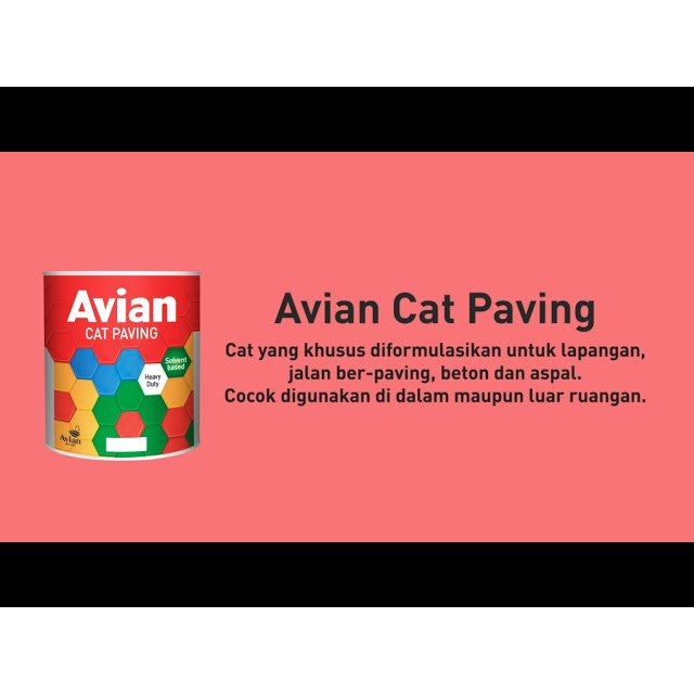 AVIAN CAT PAVING adalah cat yang khusus diformulasikan untuk lapangan, jalan berpaving, beton, dan aspal. Cocok digunakan di dalam maupun luar ruangan. Avian Cat Paving juga diaplikasikan untuk lapangan parkir, lapangan olahraga, jogging track, taman bermain, trotoar, dan marka jalan yang terbuat dari beton, asbes, semen, aspal, dan seng. Avian cat Paving ini tahan lama, cepat kering, tahan abrasi, dan mudah diaplikasikan.