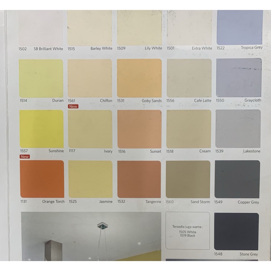 1501 EXTRA WHITE 1502 SB BRILLIANT WHITE 1503 BLUE WHITE ( PUTIH KEBIRUAN KAYA PUTIH METROLITE SALJU ) 1505 WHITE 1509 LILY WHITE 1514 DURIAN 1515 BARLEY WHITE 1516 SUNSET 1518 CREAM 1519 BLACK 1522 TROPICA GREY 1523 VICTORIA 1524 FRESH GREEN 1525 JASMINE 1526 BLUE BEAUTY 1529 SOFT WHITE 1531 GOBY SANDS 1532 TANGERINE 1534 MARINA 1539 LAKESTONE 1540 GREEN FREEWAY 1541 ATLANTIC 1546 LIME GREEN 1547 SWIMMING BLUE 1548 STONE GREY 1549 COPPER GREY 1550 GRAYCLOTH 1552 PINK ROSSY 1553 LAVENDER PRINT 1554 HAPPY FUSCHIA 1555 PEACE BLUE 1556 CAFE LATTE 1557 SUNSHINE 1558 BABY BABY 1559 LILAC DREAM 1560 SAND STORM 1561 CHIFFON 1562 CANDY PINK 1117 IVORY 1131 ORANGE TORCH 1657 BRIGHT GREEN ( IJO BOLU PANDAN ) 1671 MOON GLOW 1154 HIJAU TELOR