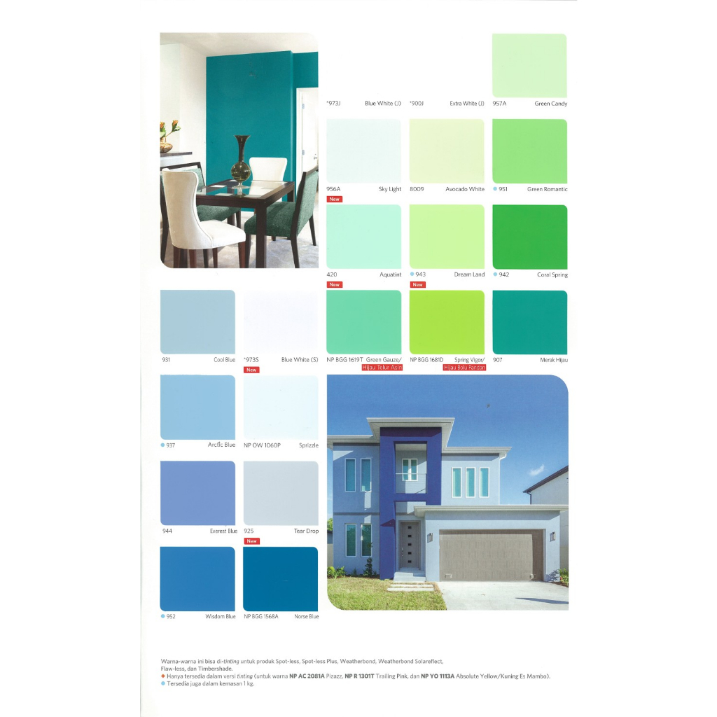 WARNA READYMIX PABRIK (*) 300 WHITE 300SS WHITE 900 EXTRA WHITE 330 LINEN WHITE 9103 BLACK 8005 BARLEY WHITE 8006 LILY WHITE 926 LIGHT CREAM 934 SUNLIGHT 955A LADY PINK 952 WISDOM BLUE 937 ARTIC BLUE 951 GREEN ROMANTIC 942 CORAL SPRING 943 DREAM LAND