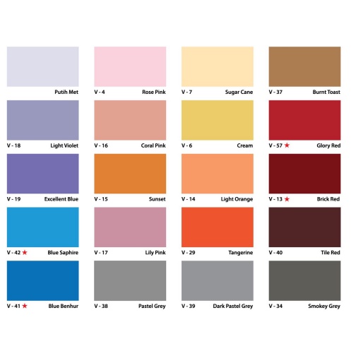V.tex Emulsion adalah cat tembok untuk interior dengan harga ekonomis dan mempunyai keunggulan tidak mengapur.