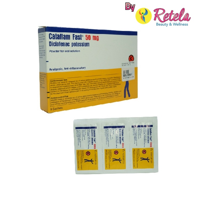 Deskripsi: CATAFLAM FAST POWDER mengandung Kalium Diclofenac yang termasuk golongan nonsteroidal anti-inflamatory drug (NSAID). Obat ini digunakan sebagai pereda nyeri, mengurangi inflamasi, dismenore, nyeri ringan sampai sedang pasca operasi khususnya ketika pasien juga mengalami peradangan. CATAFLAM FAST juga digunakan sebagai pereda nyeri pada penderita arthritis, rheumatoid arthritis, osteoarthritis, sakit gigi, migrain akut, asam urat dan nyeri karena batu ginjal ataupun batu empedu. Dalam penggunaan obat ini HARUS SESUAI DENGAN PETUNJUK DOKTER.