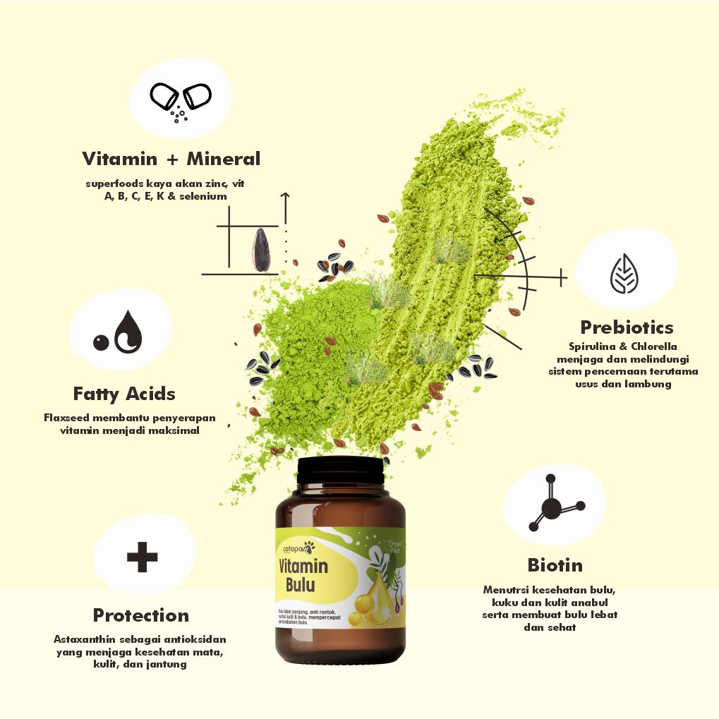 Kandungan isi : - Biotin : Menutrsi kesehatan bulu, kuku dan kulit anabul serta membuat bulu lebat dan sehat - vitamin + mineral : superfoods kaya akan zinc, vitA, B, C, E, K & selenium - Prebiotic alami : Spirulina & Chlorella menjaga dan melindungi sistem pencernaan terutama usus dan lambung - Fatty Acids : Flaxseed membantu penyerapan vitamin menjadi maksimal - Astaxanthin sebagai antioksidan yang menjaga kesehatan mata, kulit, dan jantung