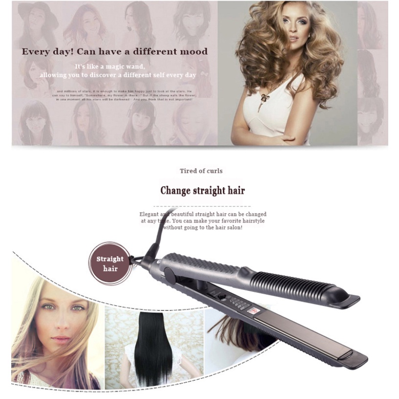 Menggambarkan: Pelurus Rambut 3-in-1: Luruskan, Keriting/Gelombang, Perpanjang Rambut Cepat panas, hanya 30 detik Pelat pemanas paduan titanium untuk pemanasan yang lebih seragam Ada pengaturan suhu: 140C, 160C, 180C, 200C, 220C