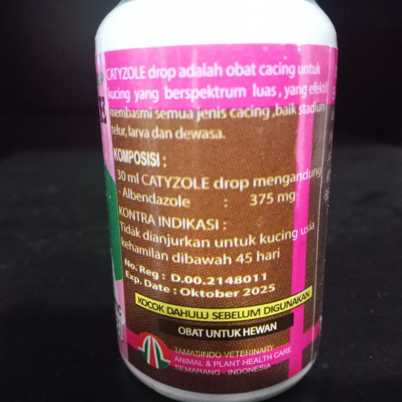 Catyzole dalah obat cacing untuk kucing yang berspektrum luas, yang efektif membasmi semua jenis cacing, baik stadium telur, larva, dan dewasa. Efektif membasmi semua jenis dan stadium cacing, cacing gelang, pita, tambang, pipih, atau cambuk, jantung, dan usus (ringworms).