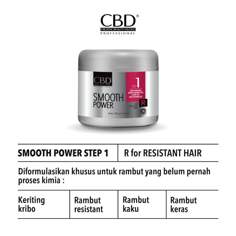 CBD Smooth Power R merupakan produk pelurusan mengandung Keratin yang berfungsi melapisi permukaan helai rambut sehingga rambut tampak berkilau alami. Dengan Sweet Almond Oil, Olive Oil dan Pro-Vitamin B5 yang akan menutrisi setiap helai rambut sehingga rambut terasa lembut dan mudah diatur. Cocok untuk rambut keriting kribo, rambut resistant dan rambut kaku.