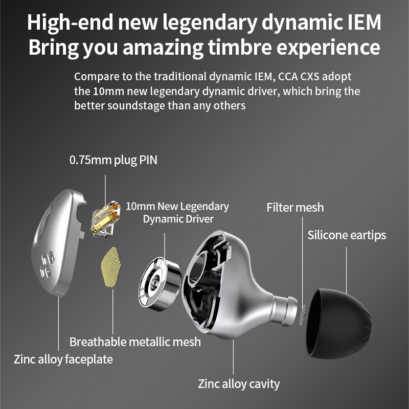 SPESIFIKASI Product Name: CCA CXS Driver : 10mm Legendary Dynamic Driver Plug Type : Jack 3.5mm Cable Length : 120±5cm Pin Type: 0.75mm QDC With Microphone : Yes Sensitivity : 109±3dB Frequency Response Range : 20-40.000Hz Resistance : 16Ω