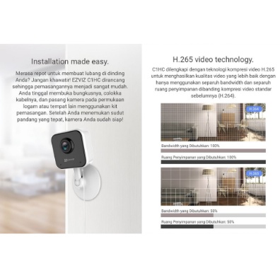 Kelebihan EZVIZ C1HC H265 (versi terbaru): * File Kompresi H265, dengan kapasitas memory yg sama C1HC durasi rekam jadi 2x lipat lebih panjang di banding C1HC versi sebelumnya H264, Kualitas gambar sama tidak ada beda. * Dengan File kompresi lebih kecil menjadikan saat streaming lebih ringan dan lebih lancar