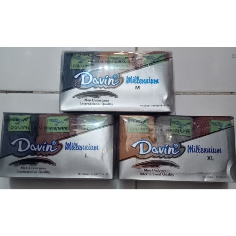 Davin milenium dan davin exclusive • Panduan ukuran : • M untuk ukuran celana 27-30 • L untuk ukuran celana 30-33 • XL untuk ukuran celana 33-36 • Harga tertera per pack. 1 pack isi 3 pcs • Warna dikirim adalah seri bawaan dari pabrik Langsung Saja Diorder