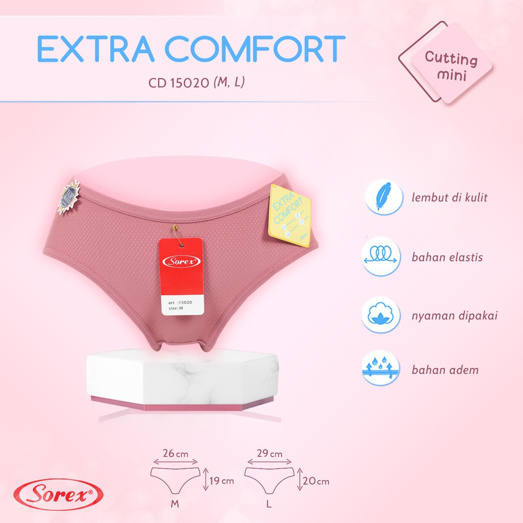 Celana dalam wanita Extra Comfort wajib banget Ladies cobain. Celana dalam Sorex Extra Comfort didesain khusus dengan tekstur pori-pori yang memberi efek super adem dan nyaman pada saat dipakai loh. Bahannya adem, lembut dan elastis, jadi udah pasti terjamin kenyamanannya.