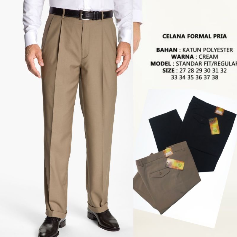 CELANA FORMAL PRIA WARNA : HITAM.CREAM/KHAKY.NAVY/DONGKER PANJANG CELANA : 102cm UNTUK SIZE : 27-38 BAHAN : KAIN KATUN TEFLON MERK : CALDIN AYO DI ORDER SEKARANG JUGA