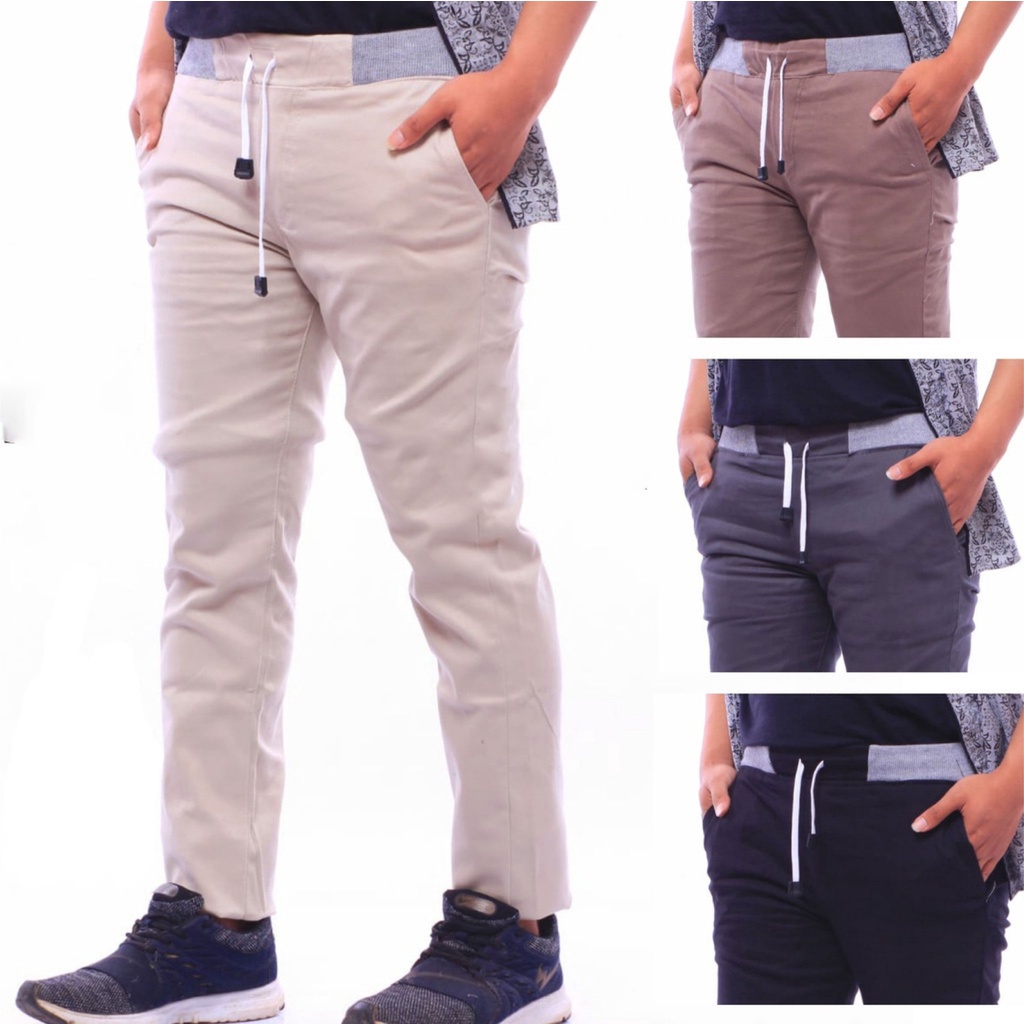 Detail Celana Chino Panjang Pria Pinggang Karet Rib Bahan Katun Combed Stretch Melar - Morris Store